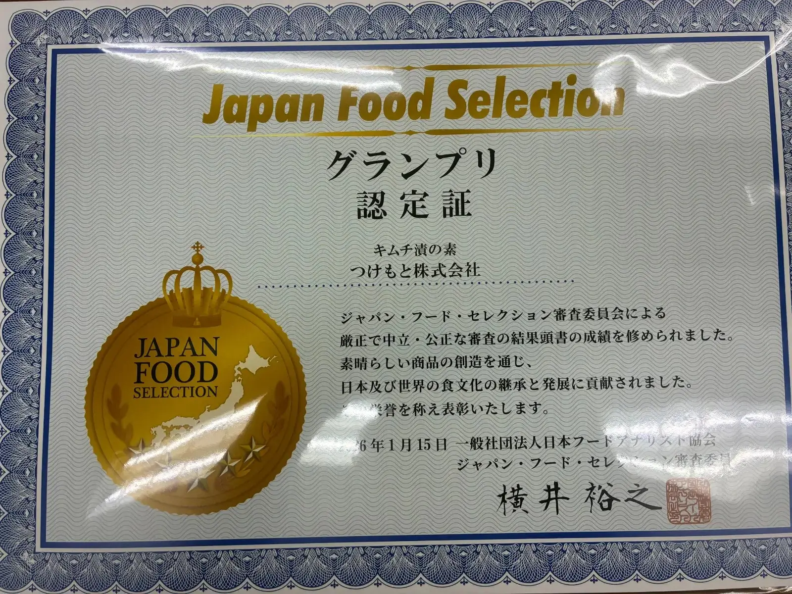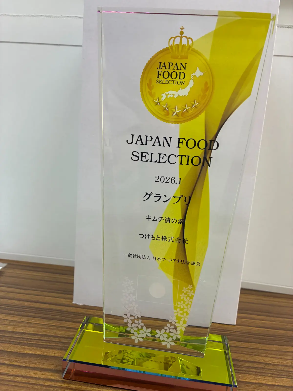 「キムチ漬の素」グランプリ。認定証とトロフィーを受領しました。